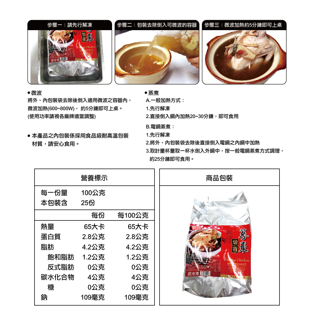 原料:雞肉、水、紅棗、蔘鬚、枸杞、米酒、L-麩酸鈉、鹽、糖
