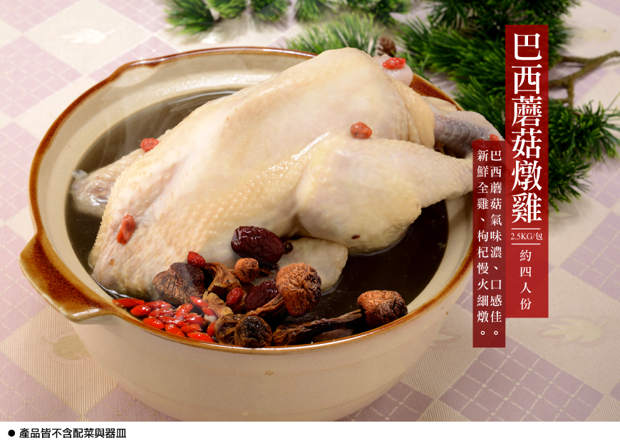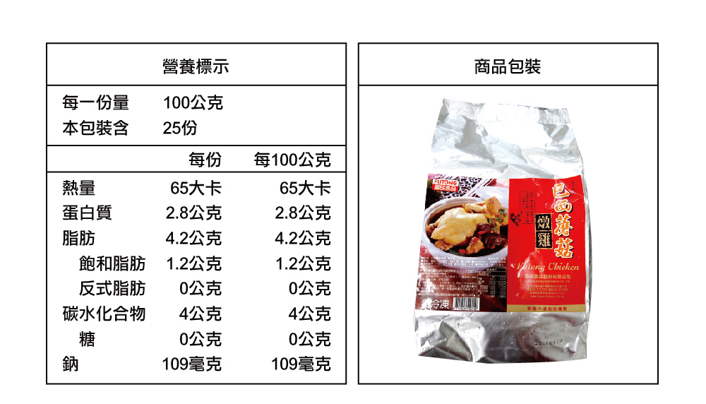 原料:雞肉、水、鳳梨、巴西蘑菇、薑、枸杞、蔥、胡椒粒、米酒、糖、鹽。