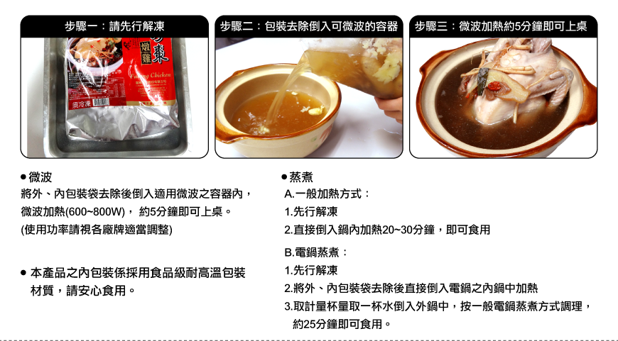 B.電鍋加熱:1.先行解凍。2.將內、外包裝袋去除,產品直接倒入電鍋之內鍋中。3.取計量杯取一杯水倒入外鍋中,按一般電鍋蒸煮方式調理,25分鐘即可食用。產品內包裝袋採食品級耐高溫包裝材質,請安心食用。