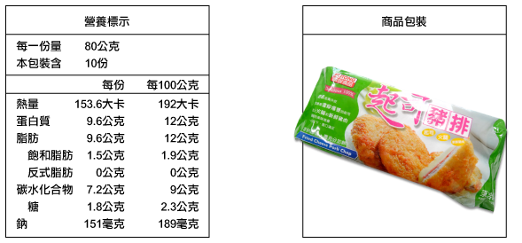 原料:豬肉〔台灣、丹麥(不含萊克多巴胺)〕、麵粉、麵包粉﹝麵粉(小麥、L-抗壞血酸)、水、精製棕櫚油(棕櫚油、香料、混合濃縮生育醇(抗氧化劑))、鹽、黃豆粉、酵母、玉米澱粉、硫酸鈣、碳酸氫銨製劑(碳酸氫銨、碳酸鎂)、L-抗壞血酸(抗氧化劑)、酵母抽出物、精製 椰子油﹞、水、起司、火腿(台灣)、蛋白粉、沙拉油、鹽、L-麩酸鈉、黏稠劑(鹿角菜膠、玉米糖膠、糖)、品質改良劑(多磷酸鈉、焦磷酸鈉、焦磷酸鉀)、胡椒、抗氧化劑(異抗壞血酸鈉)