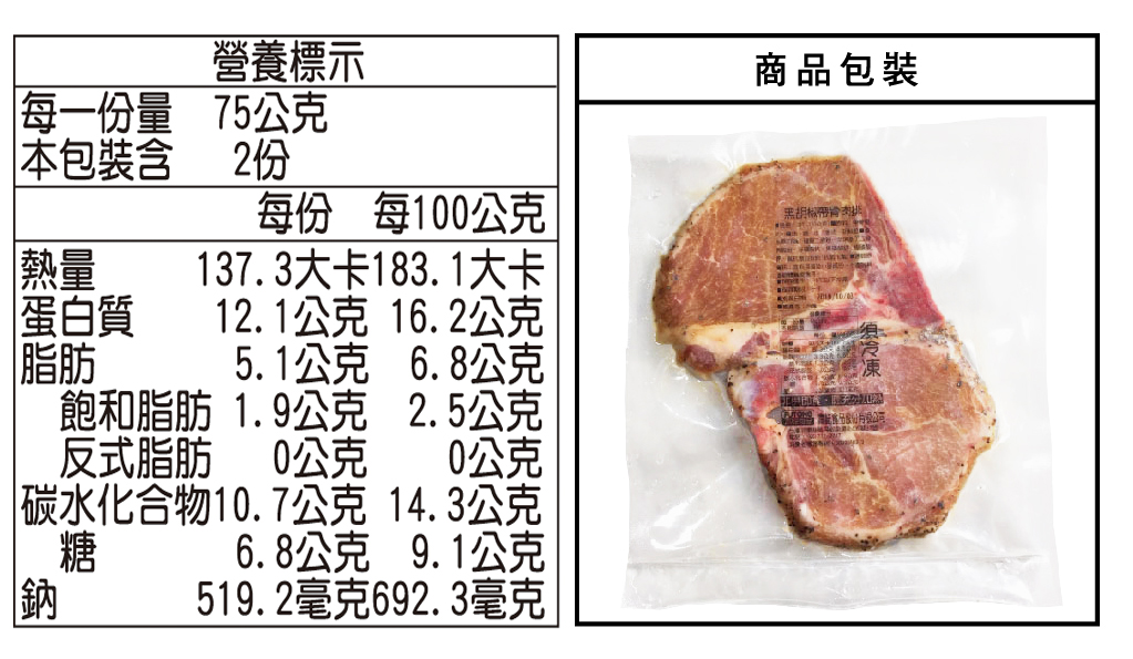 成份:帶骨里肌(台灣)、醬油、糖、水、調和香油(大豆油、芝麻油)、磷酸二澱粉、辛烯基丁二酸鈉澱粉、品質改良劑(多磷酸鈉、焦磷酸鈉、焦磷酸鉀)、抗氧化劑(異抗壞血酸鈉)、胡椒粒