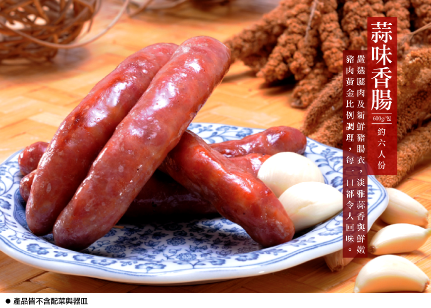 成分:豬肉(台灣)、糖、豬腸衣(美國)、鹽、蛋白粉、蒜、蒜粉(蒜粉、二氧化矽)、L-麩酸鈉、品質改良劑(燒鉀明礬、鉀明礬、檸檬酸鈉、多磷酸鈉)、抗氧化劑(異抗壞血酸鈉)、菸鹼醯胺、亞硝酸鈉