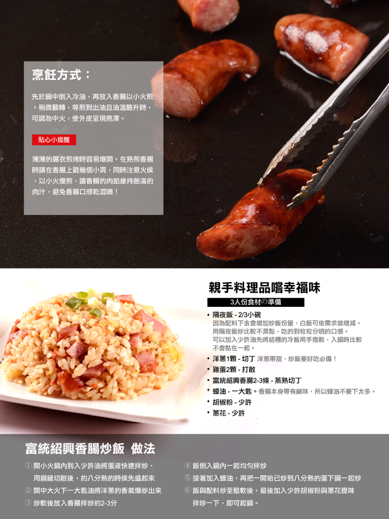 成分:豬肉(台灣)、糖、豬腸衣(美國)、紹興酒、蛋白粉、鹽、品質改良劑(燒鉀明礬、鉀明礬、檸檬酸鈉、多磷酸鈉)、五香粉(大茴、小茴、甘草、肉桂、草果)、抗氧化劑(異抗壞血酸鈉)、亞硝酸鈉
