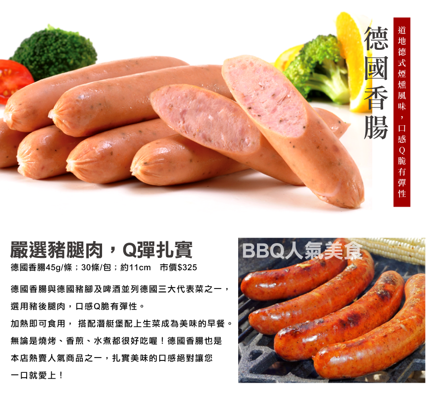 成份:豬肉〔台灣、加拿大(不含萊克多巴胺)〕、雞肉、膠原蛋白腸衣(牛來源)、 水、磷酸二澱粉、辛烯基丁二酸鈉澱粉、鹽、糖、胡椒、品質改良劑〔多磷酸鈉、焦磷酸鈉(無水)、偏磷酸鉀〕、煙燻粉(麥芽糊精、天然煙燻香料、二氧化矽)、抗氧化劑(異抗壞血酸鈉)、肉豆蔻粉、蒜、亞硝酸鈉