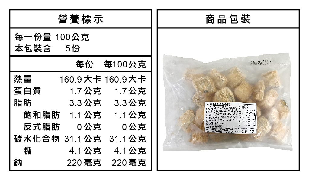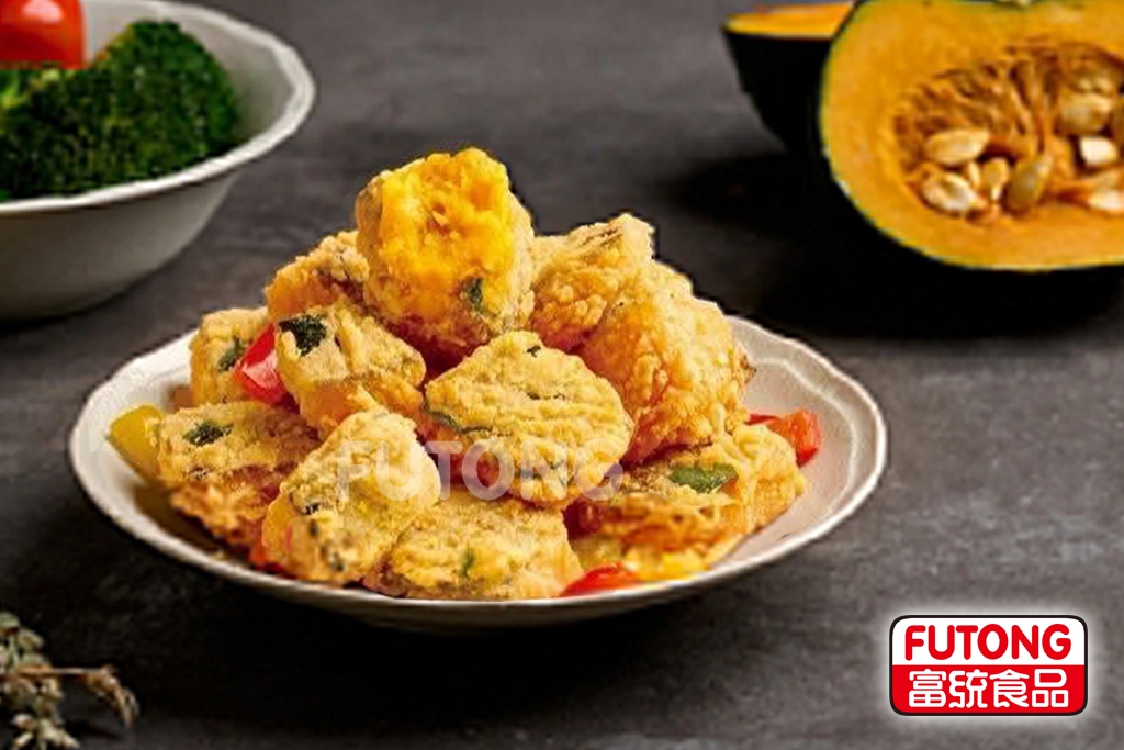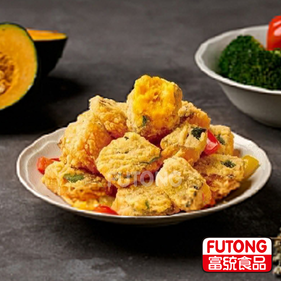 成分:栗香南瓜、水、樹薯澱粉、玉米粉、麵粉、食鹽、碳酸氫鈉、蛋白粉、大豆油、酸性焦磷酸鈉、麵包屑{麵粉(小麥麵粉、維生素C(抗氧化劑)、澱粉水解酵素(含樹薯澱粉、糊精)、聚木醣酵素(含樹薯澱粉、麵粉)、磷脂酵素(含樹薯澱粉、麵粉)、鹽、糖、酵母}、胡椒、L-麩酸鈉、麥芽糊精、糖粉、甘草粉、肉桂粉、丁香粉、醬油粉(純釀造醬油、麥芽糊精、L-麩酸鈉、琥珀酸二鈉、5'-次黃嘌呤核醣磷酸二鈉、5'-鳥嘌呤核醣磷酸二鈉)、花椒粉、玉米糖膠、紅椒色素