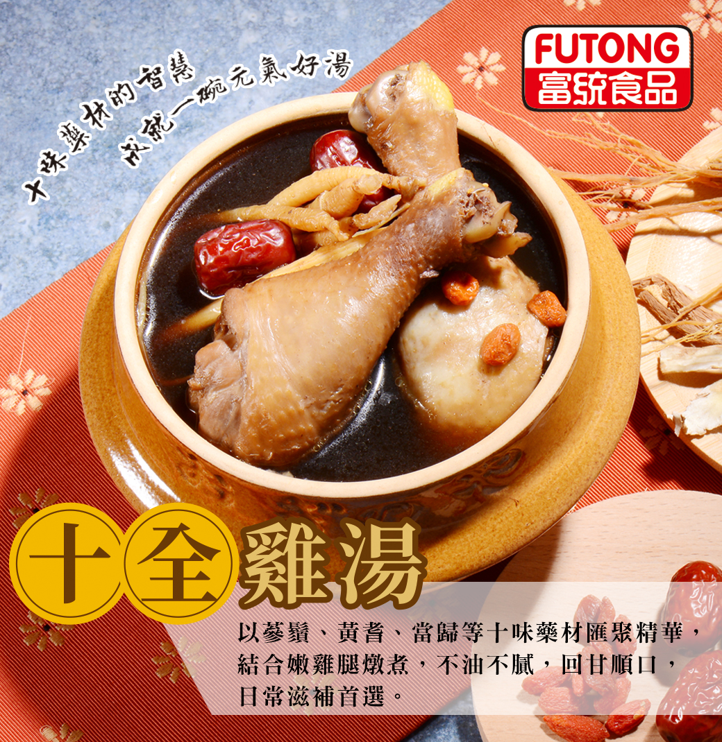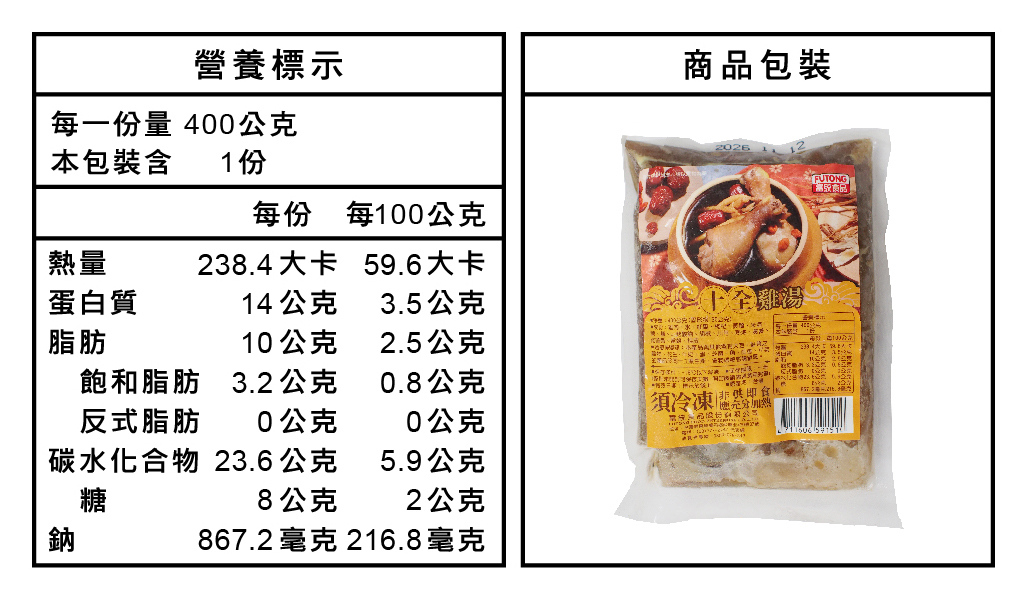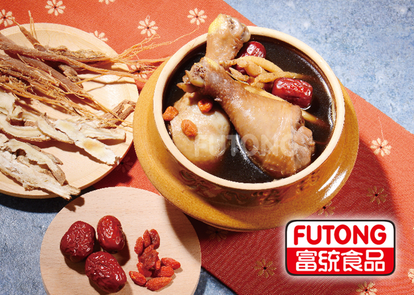 成分:雞肉、水、紅棗、枸杞、蔘鬚、米酒、糖、鹽、L-麩酸鈉、胡椒、川芎、熟地、黃耆、何首烏、當歸、桂皮