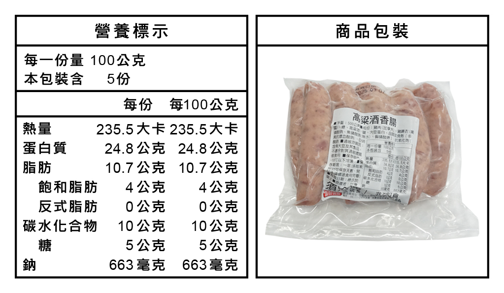 成分:豬肉(加拿大)、豬腸衣(美國)、糖、高粱酒、鹽、大豆蛋白、品質改良劑〔多磷酸鈉、焦磷酸鈉(無水)、偏磷酸鉀〕、抗氧化劑(異抗壞血酸鈉)、亞硝酸鈉