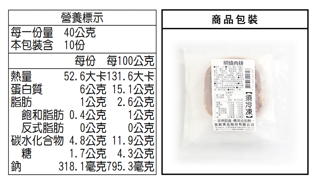 成份:豬肉(加拿大)、水、醬油、糖、麥芽糊精、磷酸二澱粉、辛烯基丁二酸鈉澱粉、蒜粉(蒜粉、二氧化矽)、胡椒、品質改良劑(多磷酸鈉、焦磷酸鈉、焦磷酸鉀)、抗氧化劑(異抗壞血酸鈉)
