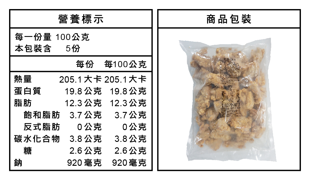 成分:雞肉、樹薯澱粉、水、米霖(糯米、米麴、果糖、水、釀造醋、鹽)、米酒、蛋、蒜、鹽、糖、胡椒、辣椒粉、品質改良劑(多磷酸鈉、焦磷酸鈉、焦磷酸鉀)、抗氧化劑(異抗壞血酸鈉)、芥花油