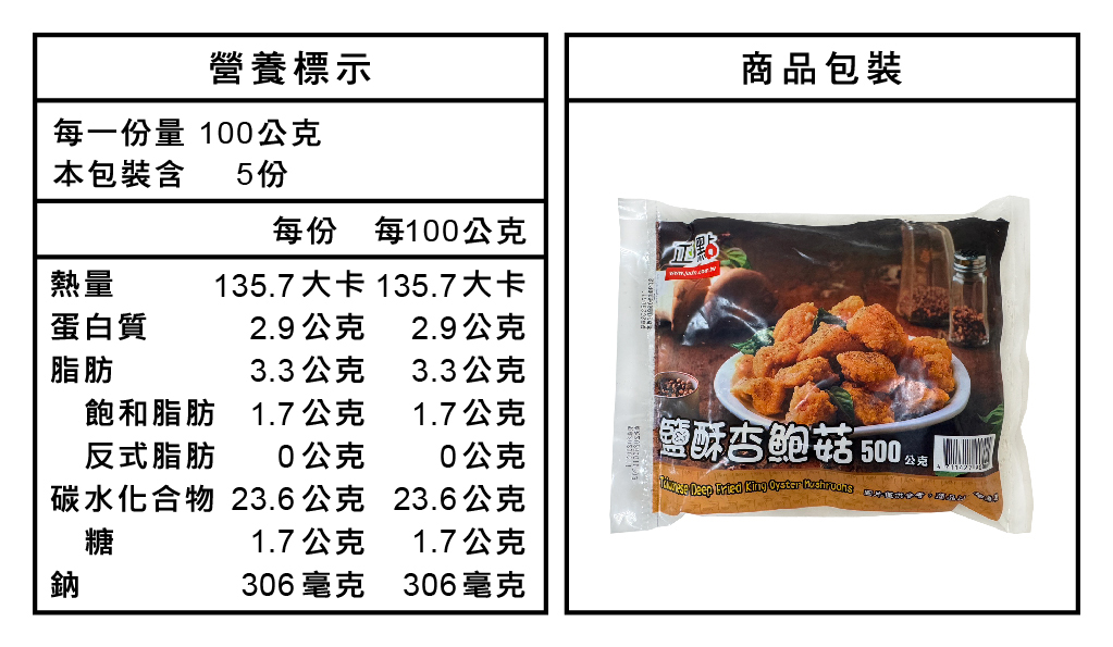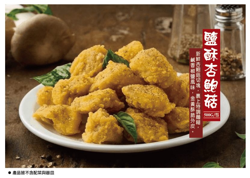 成分:杏鮑菇、水、酥炸粉(麵粉、玉米澱粉、樹薯澱粉、馬鈴薯澱粉、乳酸鈣、酸性焦磷酸鈉、碳酸氫鈉、玉米粉、食鹽、L-麩酸鈉、乙醯化已二酸二澱粉、β-胡蘿蔔素、麥芽糊精)、小麥澱粉、小麥蛋白、多磷酸鈉、玉米糖膠、調味料〔食鹽、紅薯渣粉、辣椒粉、胡椒、L-麩酸鈉、麥芽糊精、樹薯澱粉、糖粉、甘草粉、肉桂粉、丁香粉、醬油粉(純釀造醬油、麥芽糊精、L-麩酸鈉、琥珀酸二鈉、5'-次黃嘌呤核苷磷酸二鈉、5'-鳥嘌呤核苷磷酸二鈉)、花椒粉、小茴香、白芷、山奈、大茴香、陳皮〕